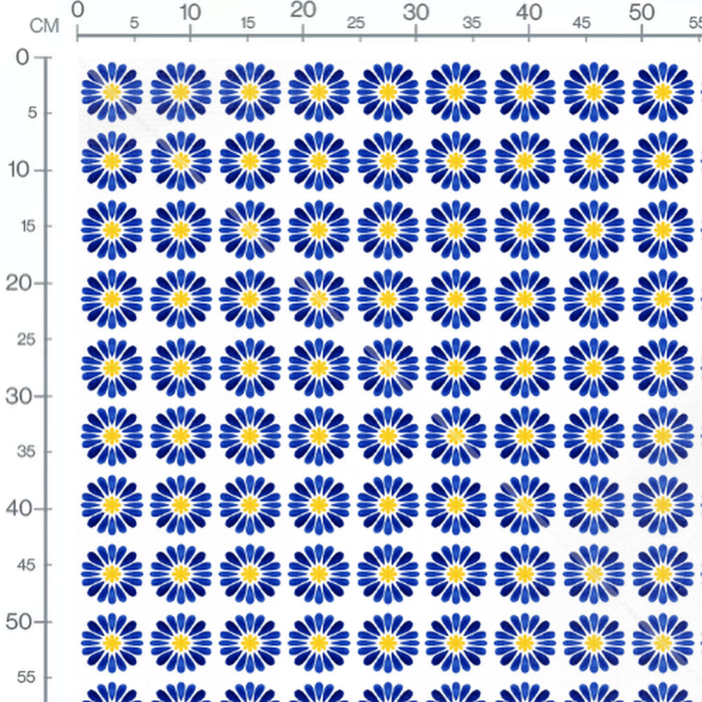 Les fleurs sont disposées de manière régulière. Chaque fleur a un centre jaune vif entouré de pétales bleus profonds.Les tissus