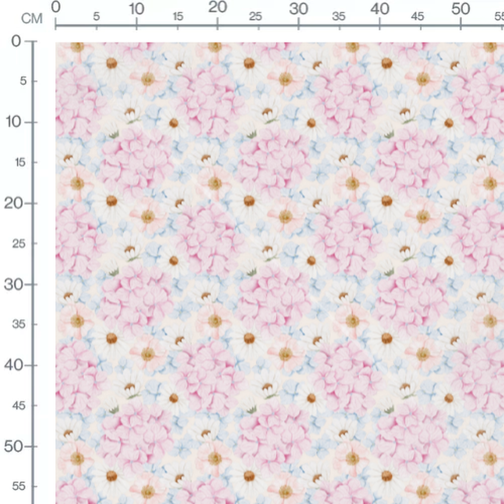 Les fleurs roses sont entourées de petites fleurs blanches. Des touches de bleu ajoutent de la douceur au motif. Les centres des fleurs sont marron et jaune, apportant un contraste subtil.Les tissus
