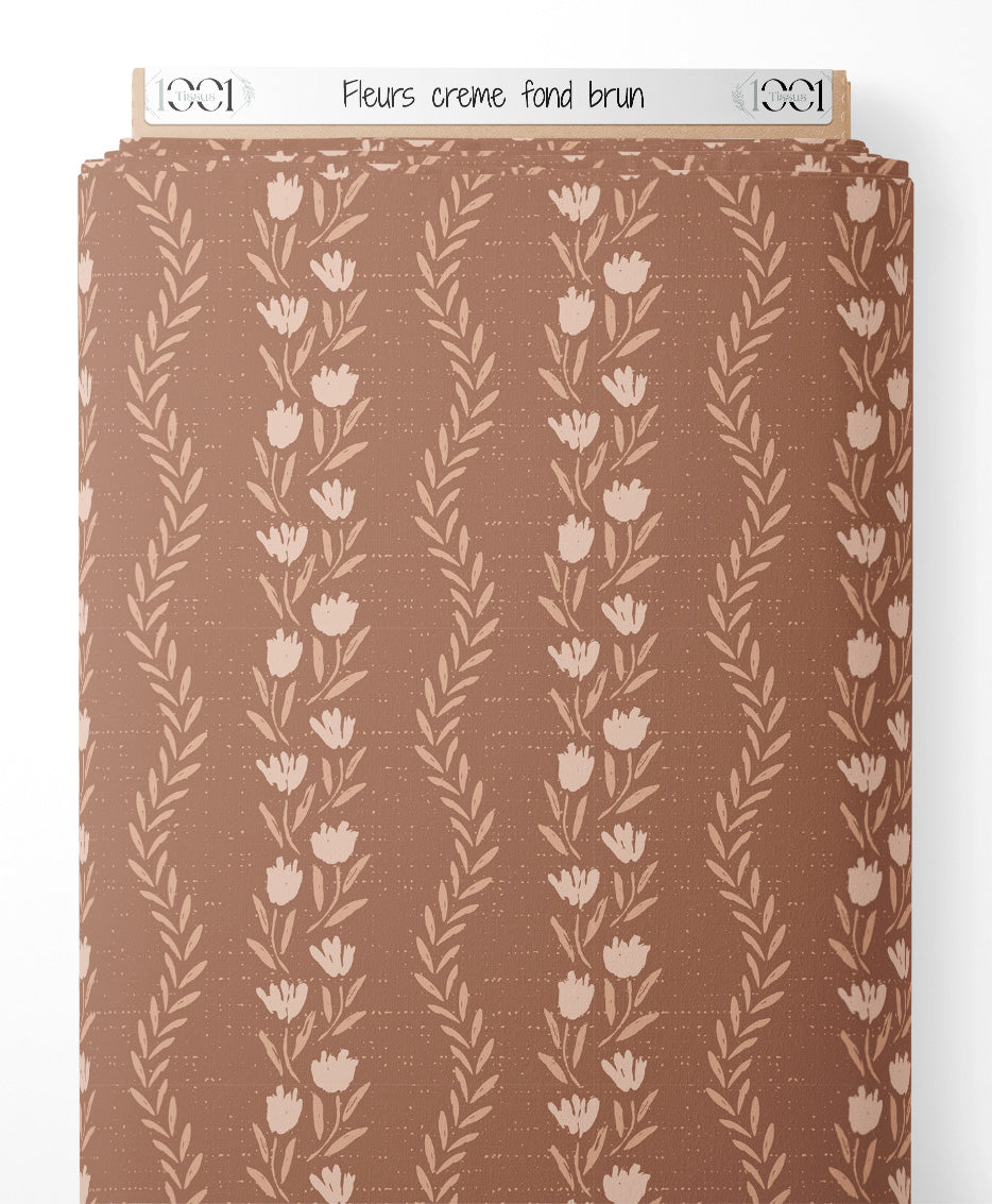 Les fleurs crème sont accompagnées de feuilles allongées. Le fond brun ajoute une touche chaleureuse au motif floral.Les tissus