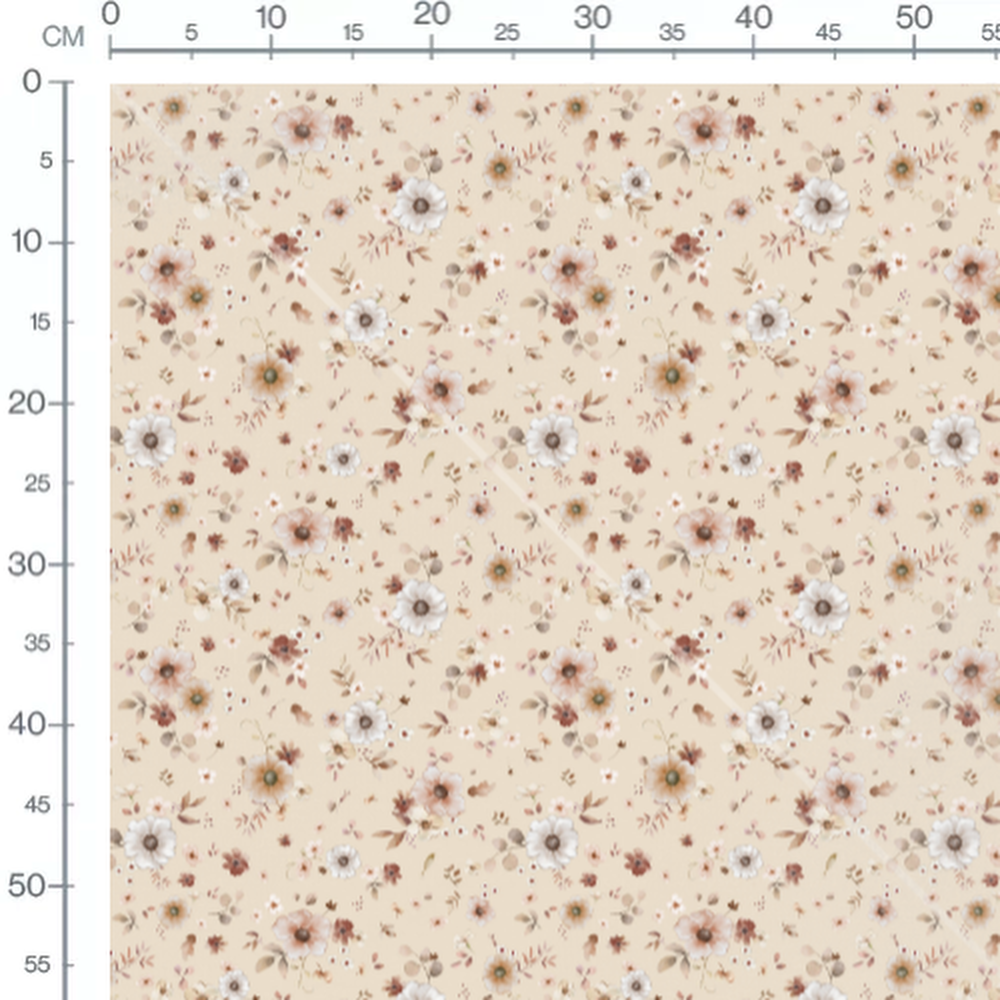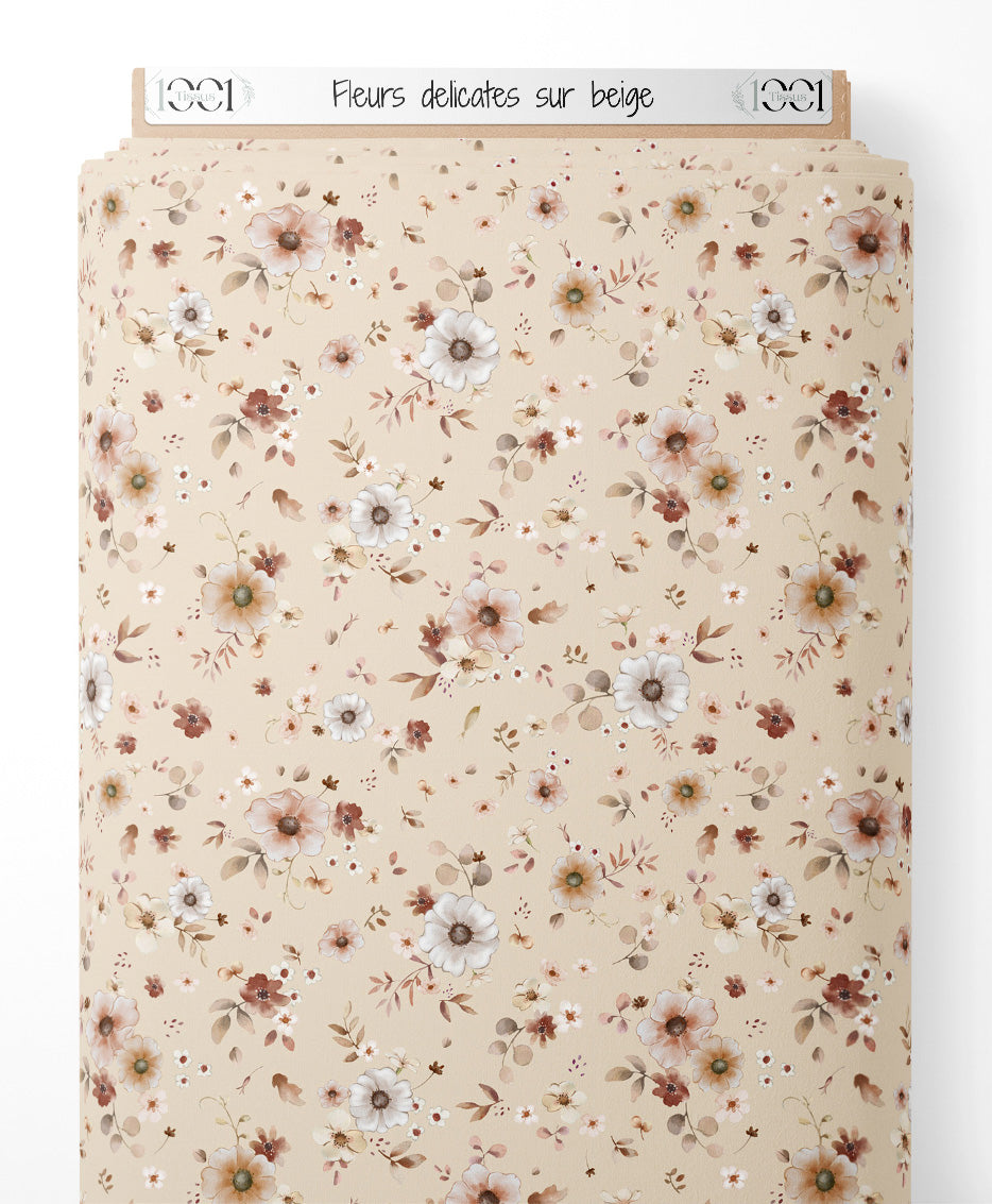 Les fleurs principales sont entourées de petites fleurs et de feuillages variés. Les nuances de brun et de rose ajoutent une touche vintage au motif. Le fond beige met en valeur les détails floraux.Les tissus