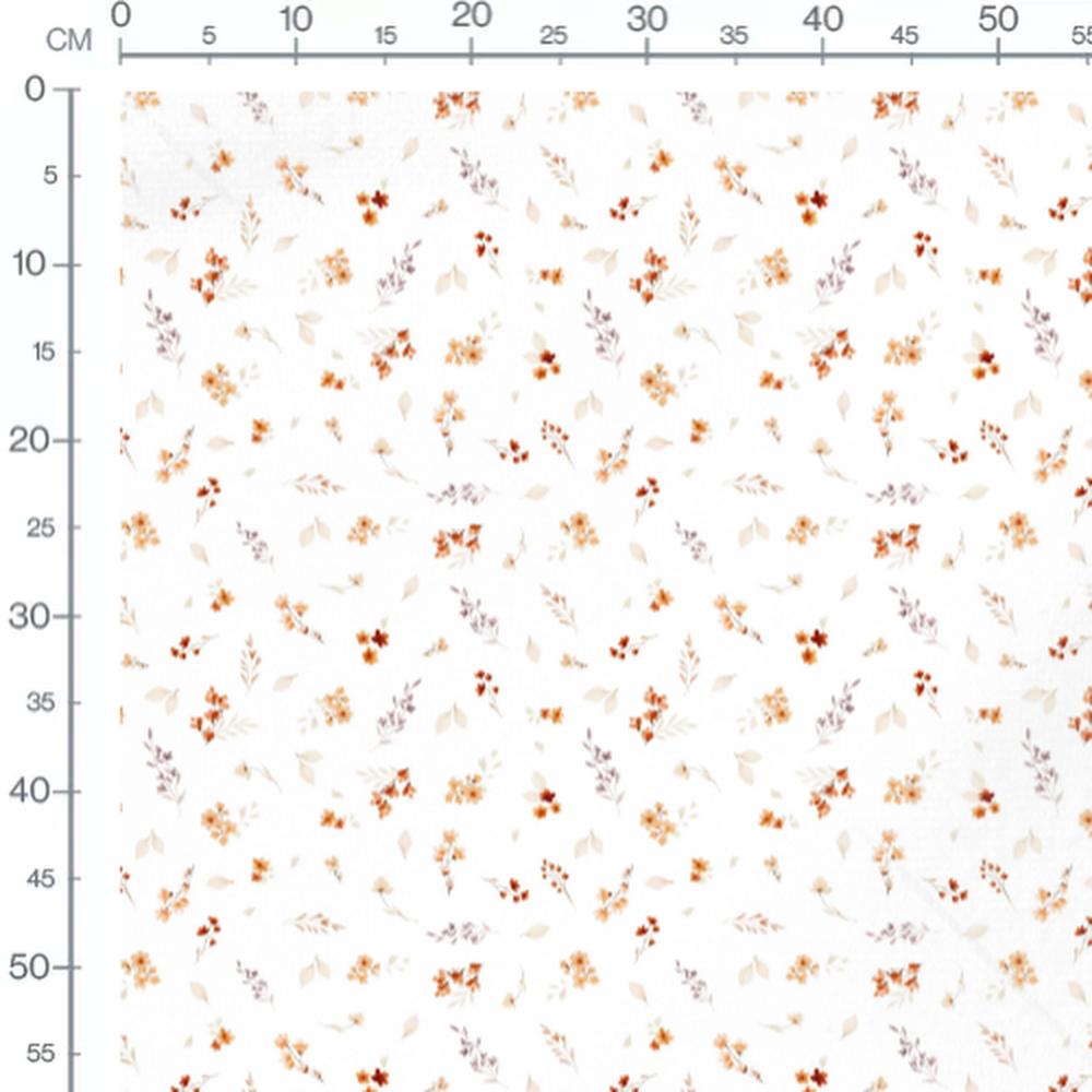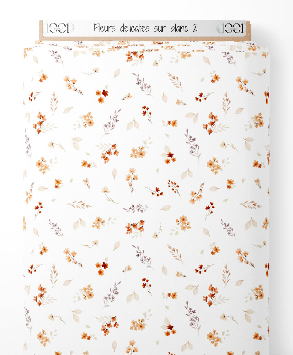 Petites fleurs dispersées avec des nuances d'orange et de beige. Branches fines avec des feuilles dans des tons de beige et de violet clair.Les tissus