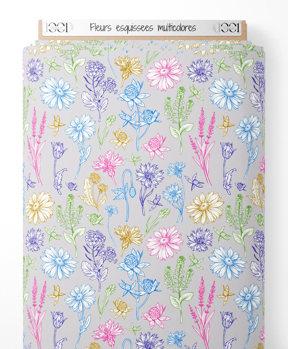 Les fleurs incluent des marguerites, des lotus et des boutons d'or. Les couleurs vives des fleurs contrastent avec le fond gris. Les motifs floraux sont détaillés avec des lignes fines.Les tissus