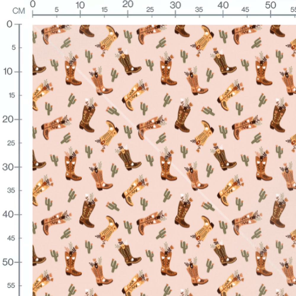 Les bottes sont ornées de motifs floraux et de feuilles. Les cactus sont parsemés de petites fleurs roses. Le fond rose pâle met en valeur les éléments du motif.Les tissus