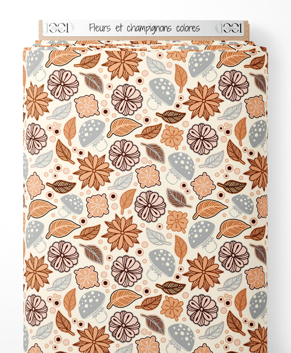Les fleurs sont de différentes tailles et nuances de marron. Les champignons sont parsemés de petits points blancs. Les feuilles sont stylisées avec des teintes de marron et d'orange.Les tissus