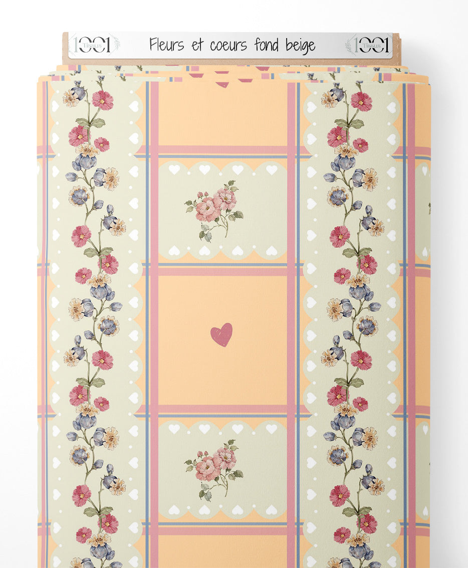 Les fleurs sont disposées en bandes verticales avec des nuances de rose et de bleu. Des motifs de cœurs blancs et roses ajoutent une touche romantique au design. Le fond pêche et beige crée une ambiance douce et harmonieuse.Les tissus