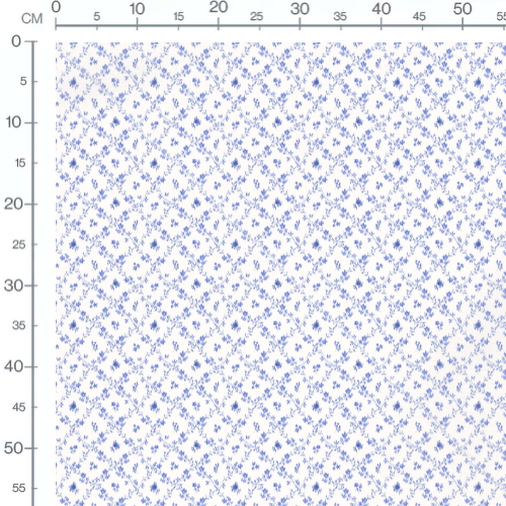 Les fleurs sont de différentes formes et tailles, créant un motif harmonieux. Les feuilles accompagnent les fleurs, ajoutant une touche de verdure stylisée. Le bleu des motifs contraste élégamment avec le fond blanc.Les tissus