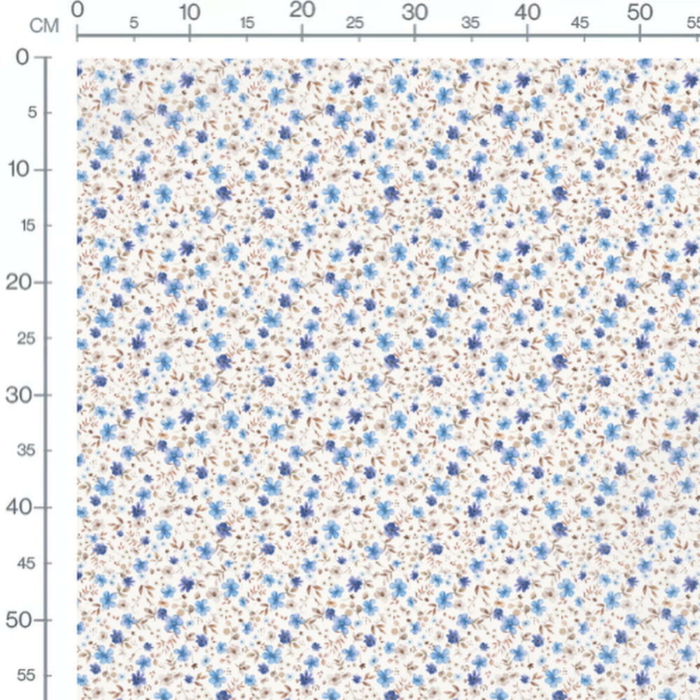 Les fleurs varient en taille et en teinte de bleu. Les feuilles sont délicatement dessinées en marron clair. De petites fleurs blanches et bleues ajoutent de la diversité au motif.Les tissus