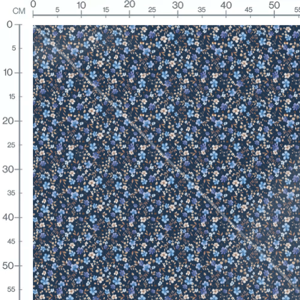 Les fleurs varient en taille et en teinte de bleu. Les petites fleurs blanches ajoutent un contraste subtil. Les feuilles sont délicatement dessinées en marron et beige.Les tissus