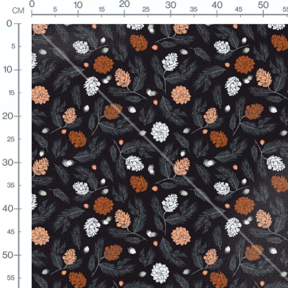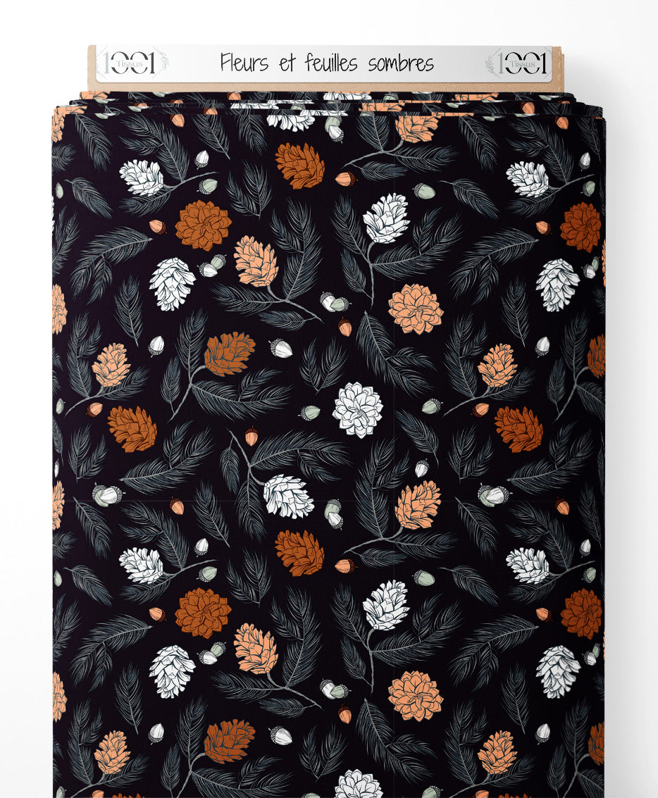 Les fleurs sont entourées de feuilles grises détaillées. Des glands de couleur beige et orange ajoutent des touches de contraste. Le fond noir met en valeur les couleurs des motifs.Les tissus