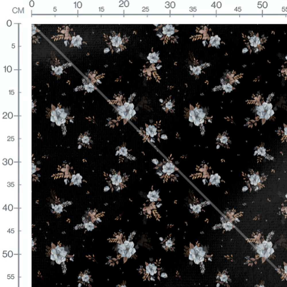 Les fleurs blanches sont entourées de feuilles brunes et de petites branches. Le fond noir met en valeur les détails floraux délicats. Les nuances de brun ajoutent une touche vintage au motif.Les tissus