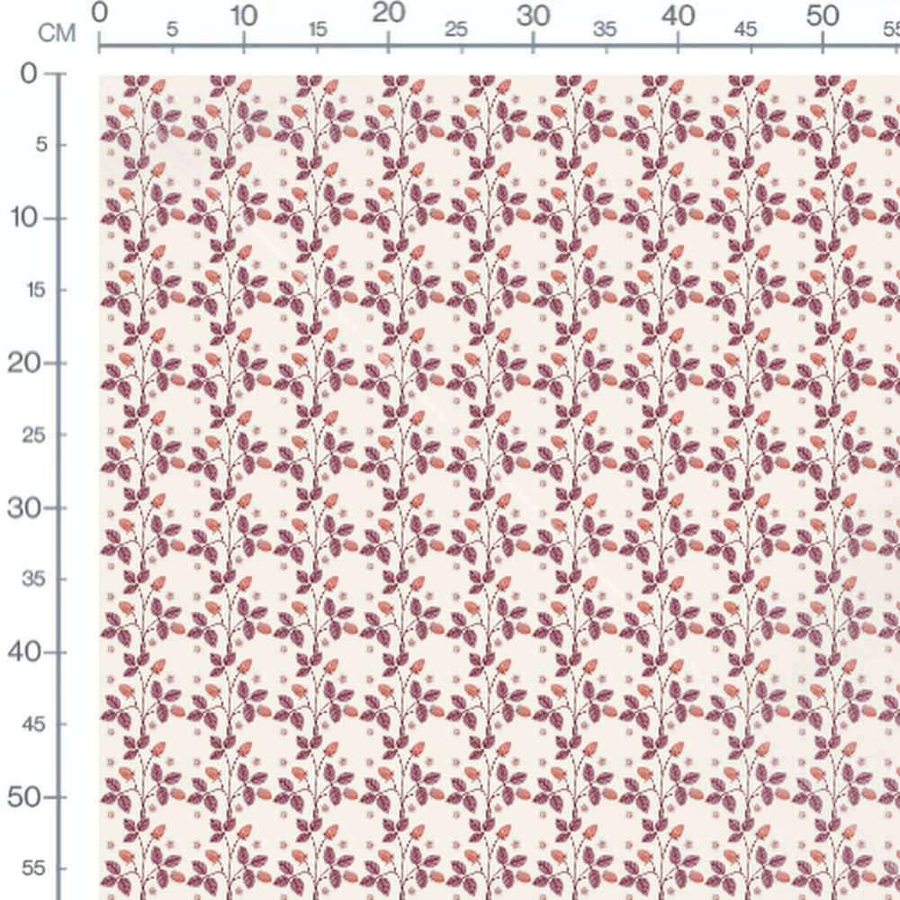 Les fraises sont d'un rouge doux avec des détails subtils. Les fleurs ont un cœur jaune entouré de pétales roses. Les feuilles sont finement dessinées avec des nervures visibles.Les tissus