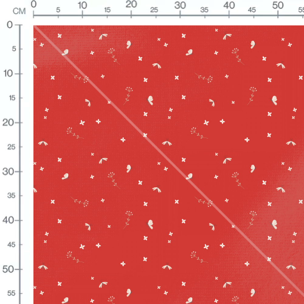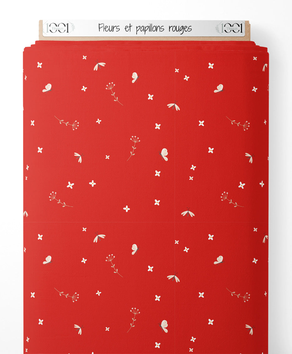 Les fleurs sont délicates et éparpillées sur le fond rouge vif. Les papillons et libellules ajoutent une touche aérienne au motif.Les tissus