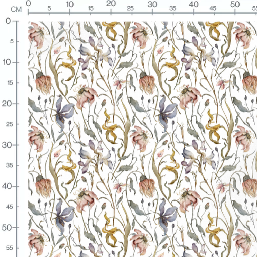 Les fleurs présentent des nuances de rose, violet et jaune. Les tiges et feuilles sont délicatement dessinées. Les motifs évoquent un style aquarelle. Les fleurs semblent fanées, ajoutant une touche vintage.Les tissus