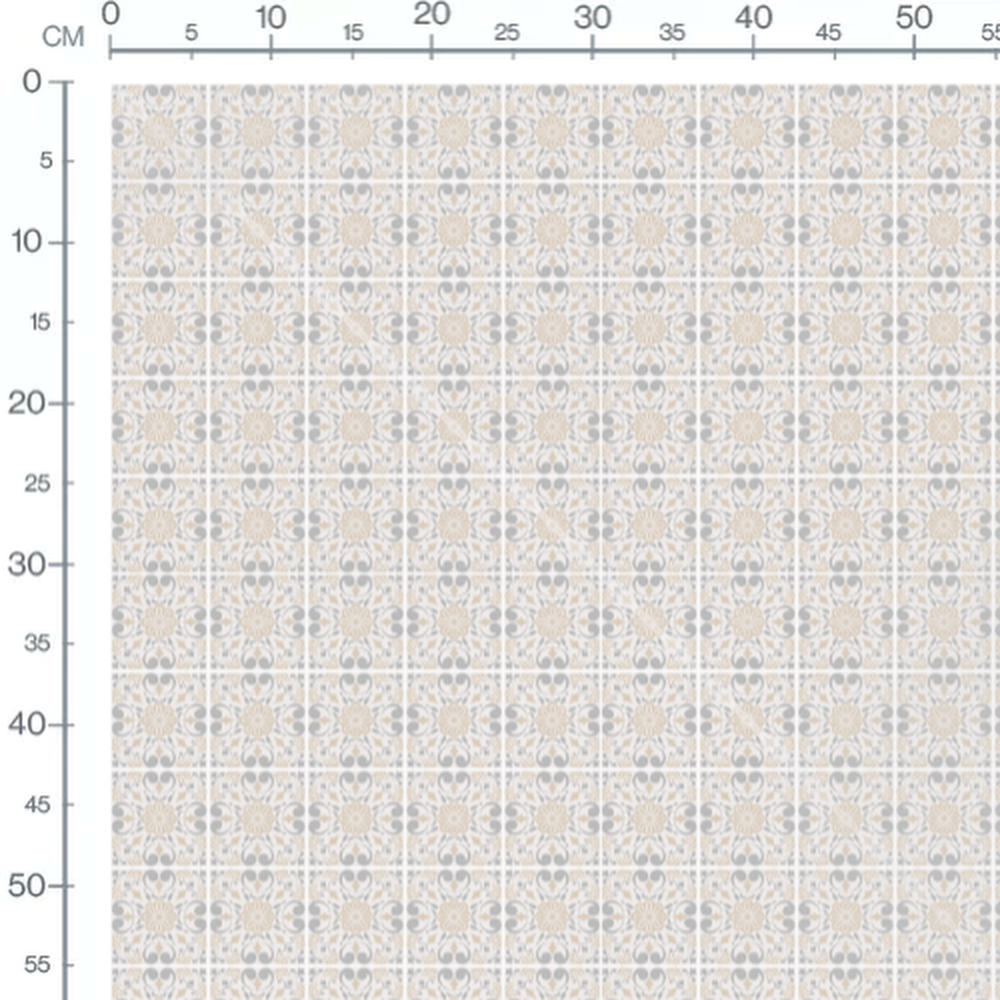 Les motifs floraux sont entourés de formes géométriques grises. Les fleurs centrales sont de couleur beige, apportant un contraste doux.Les tissus