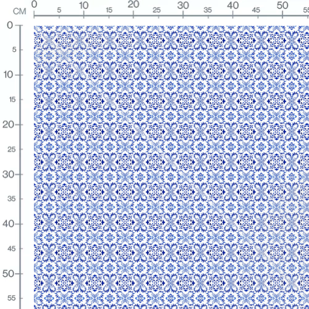 Les motifs floraux sont disposés de manière répétitive et symétrique. Chaque fleur est entourée de formes géométriques bleues. Le fond blanc met en valeur les détails complexes des motifs.Les tissus