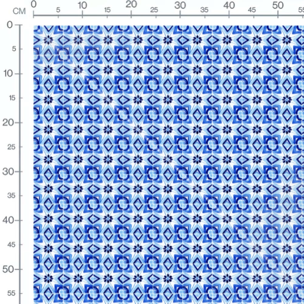Les motifs présentent des fleurs stylisées avec des pétales angulaires. Les nuances de bleu varient du clair au foncé, créant un effet visuel dynamique.Les tissus