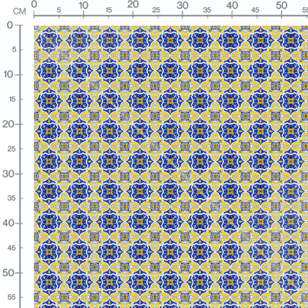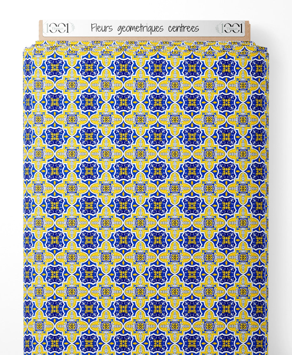 Les motifs floraux sont entourés de formes géométriques bleues et jaunes. Chaque motif floral est centré dans une structure symétrique. Les couleurs vives créent un contraste saisissant avec le fond blanc.Les tissus