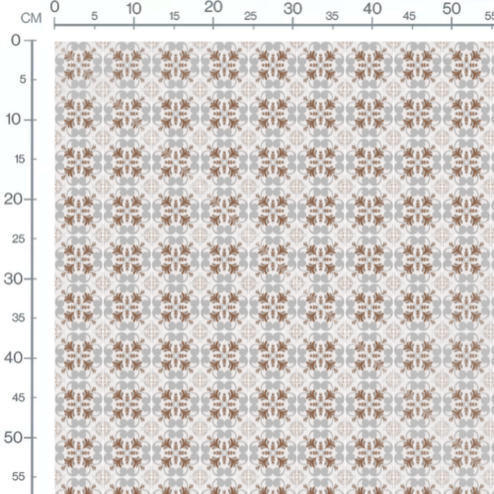 Les motifs floraux sont entourés de cercles gris. Des formes géométriques complètent le design en brun et gris.Les tissus