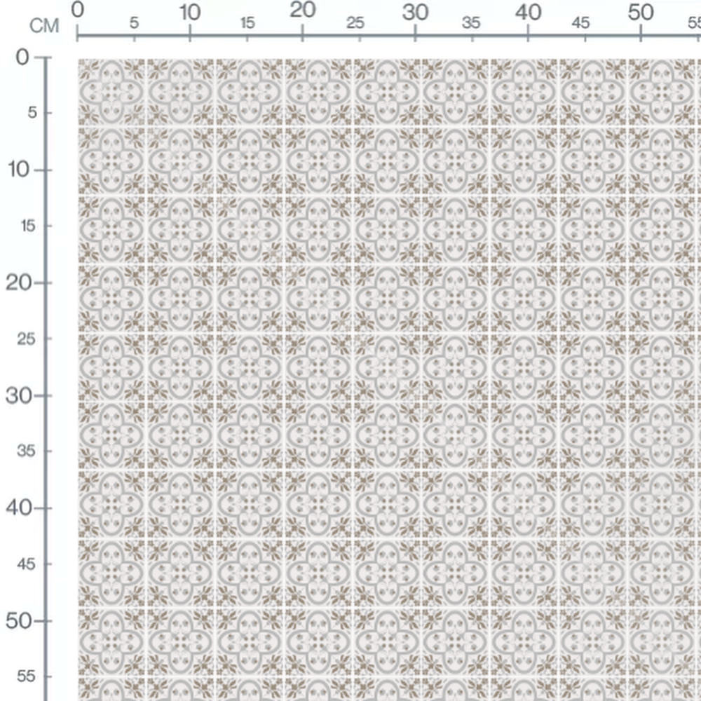 Les motifs floraux sont entourés de formes géométriques arrondies. Les couleurs dominantes sont le gris et le beige, créant un effet harmonieux. Le fond blanc met en valeur les détails des motifs.Les tissus