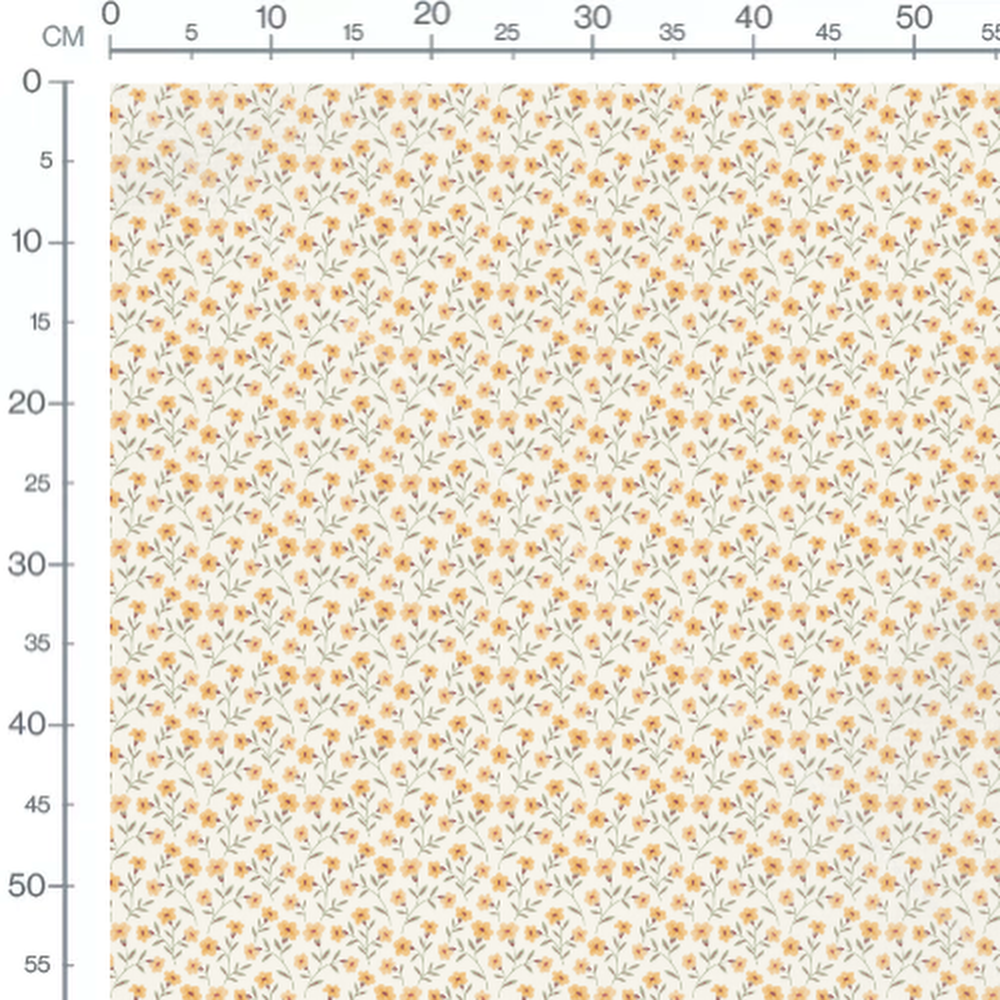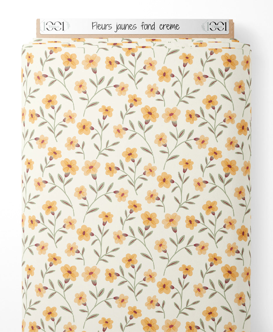 Les fleurs sont disposées de manière aléatoire avec des tiges vertes. Les pétales des fleurs sont d'un jaune doux, contrastant avec le centre rouge. Les feuilles sont d'un vert subtil, ajoutant une touche de fraîcheur au motif.Les tissus