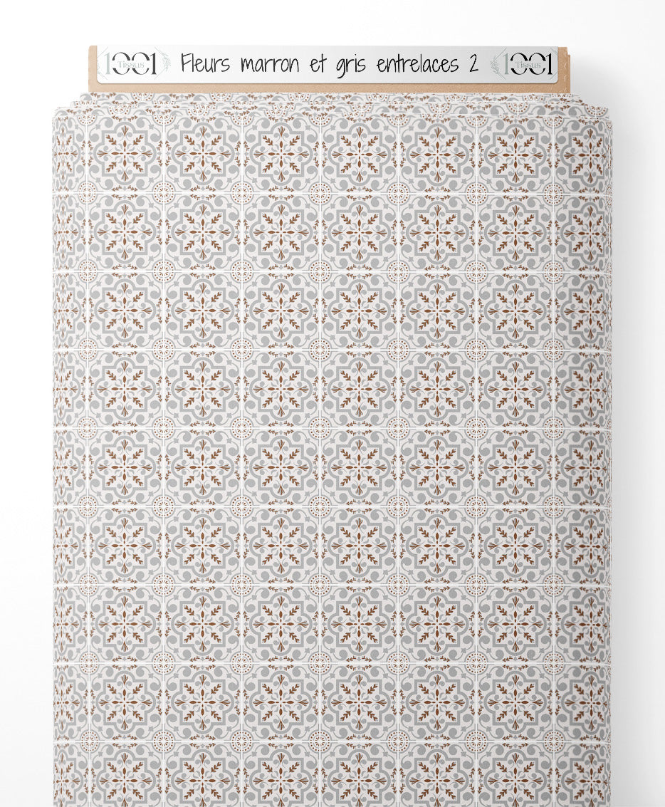 Les motifs floraux sont entourés de formes géométriques grises. Les fleurs marron sont disposées de manière symétrique. Le fond blanc met en valeur les détails complexes du motif.Les tissus