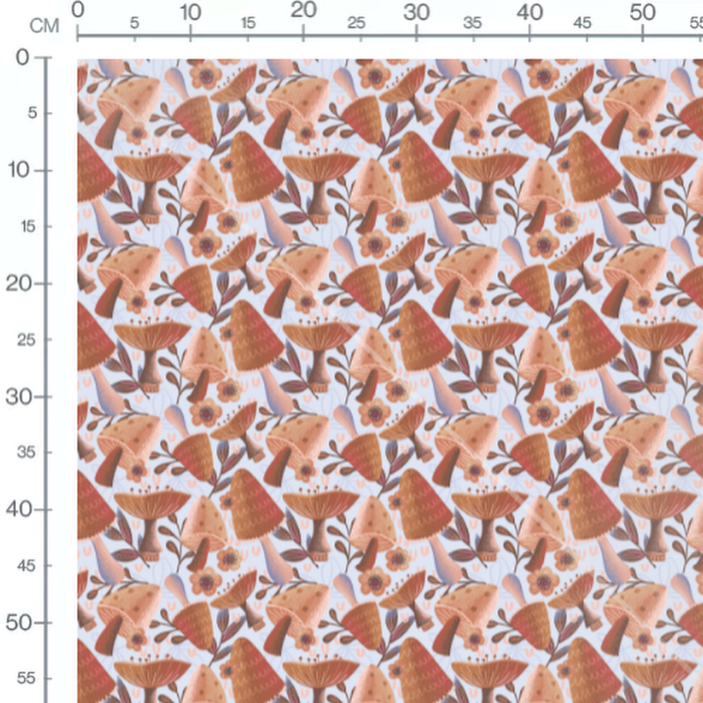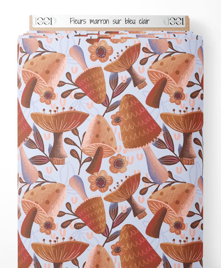Les champignons présentent des nuances de marron et beige avec des motifs délicats. Les fleurs sont stylisées avec des pétales marron et beige. Des feuilles et branches marron complètent le motif sur un fond bleu clair.Les tissus
