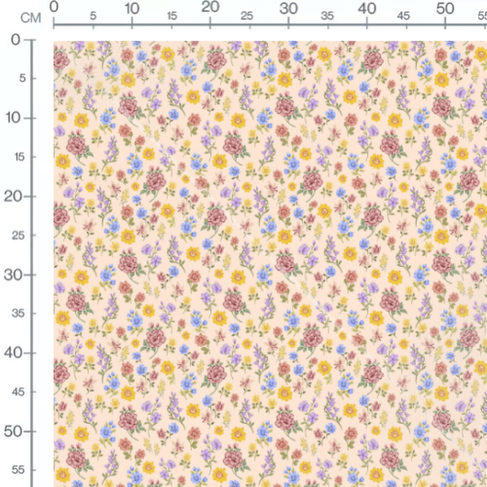 Les fleurs rouges sont entourées de petites feuilles vertes. Les fleurs jaunes et bleues ajoutent une touche vive au motif. Les fleurs violettes sont dispersées harmonieusement. Le fond beige met en valeur les couleurs des fleurs.Les tissus