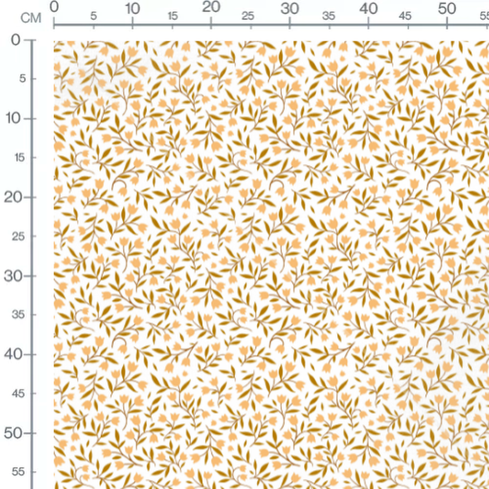 Les fleurs sont de couleur orange pâle avec des feuilles marron. Le fond blanc met en valeur le motif floral délicat. Les branches et feuilles ajoutent une touche naturelle au design.Les tissus