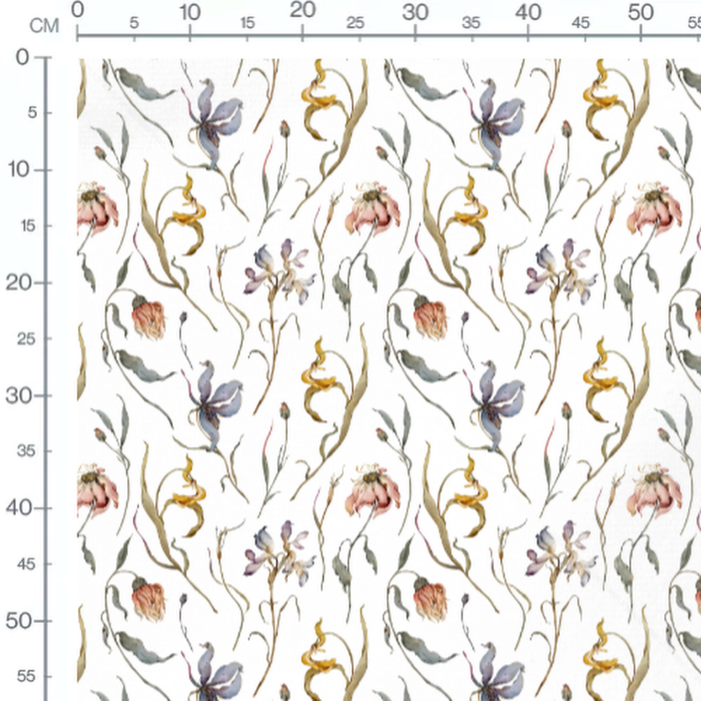 Les fleurs sont dessinées avec des traits fins et des couleurs douces. Les nuances de violet et de rose se mêlent harmonieusement. Les feuilles et tiges sont représentées en vert pâle et brun clair.Les tissus