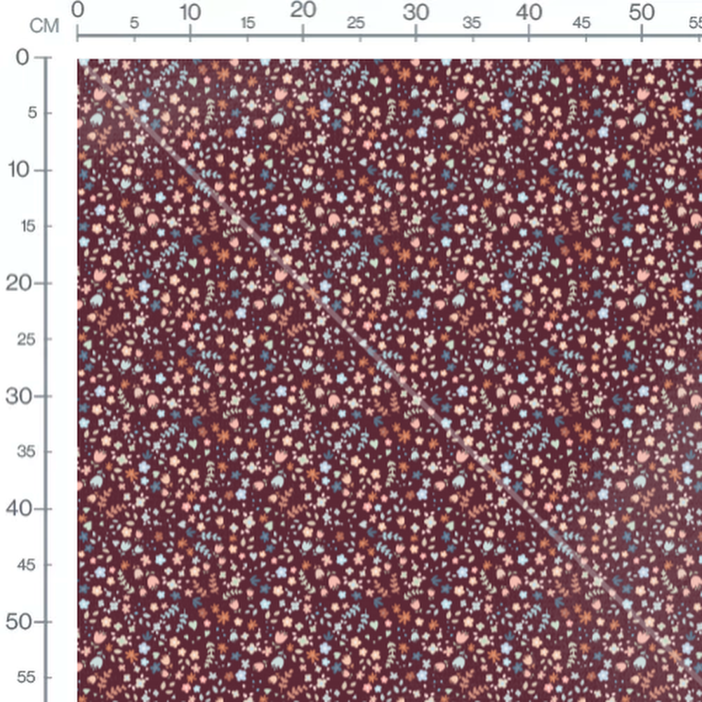 Les fleurs sont de couleurs pastel comme le rose, le bleu et le beige. Les feuilles et les cœurs ajoutent une touche de vert et de bleu clair. Le fond bordeaux met en valeur les motifs délicats.Les tissus