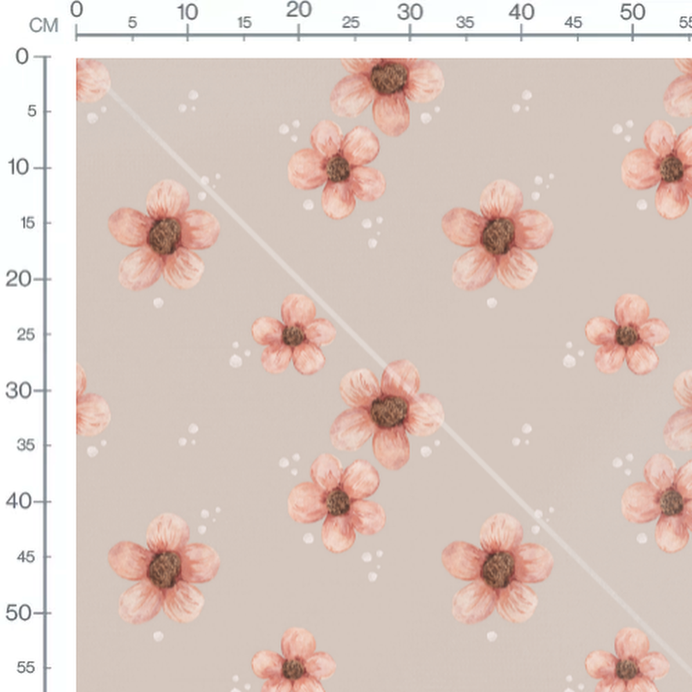 Les fleurs ont cinq pétales avec un centre brun. Les bulles blanches ajoutent une touche délicate au motif.Les tissus
