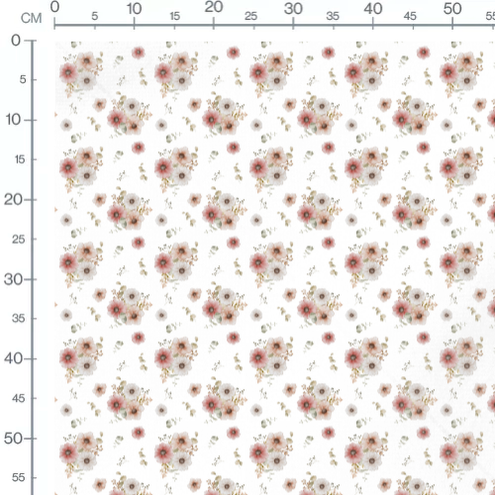 Les fleurs sont délicatement peintes en nuances de rose et blanc. Les feuilles ajoutent une touche de vert et brun au motif. Quelques petites branches et bourgeons complètent le design floral.Les tissus