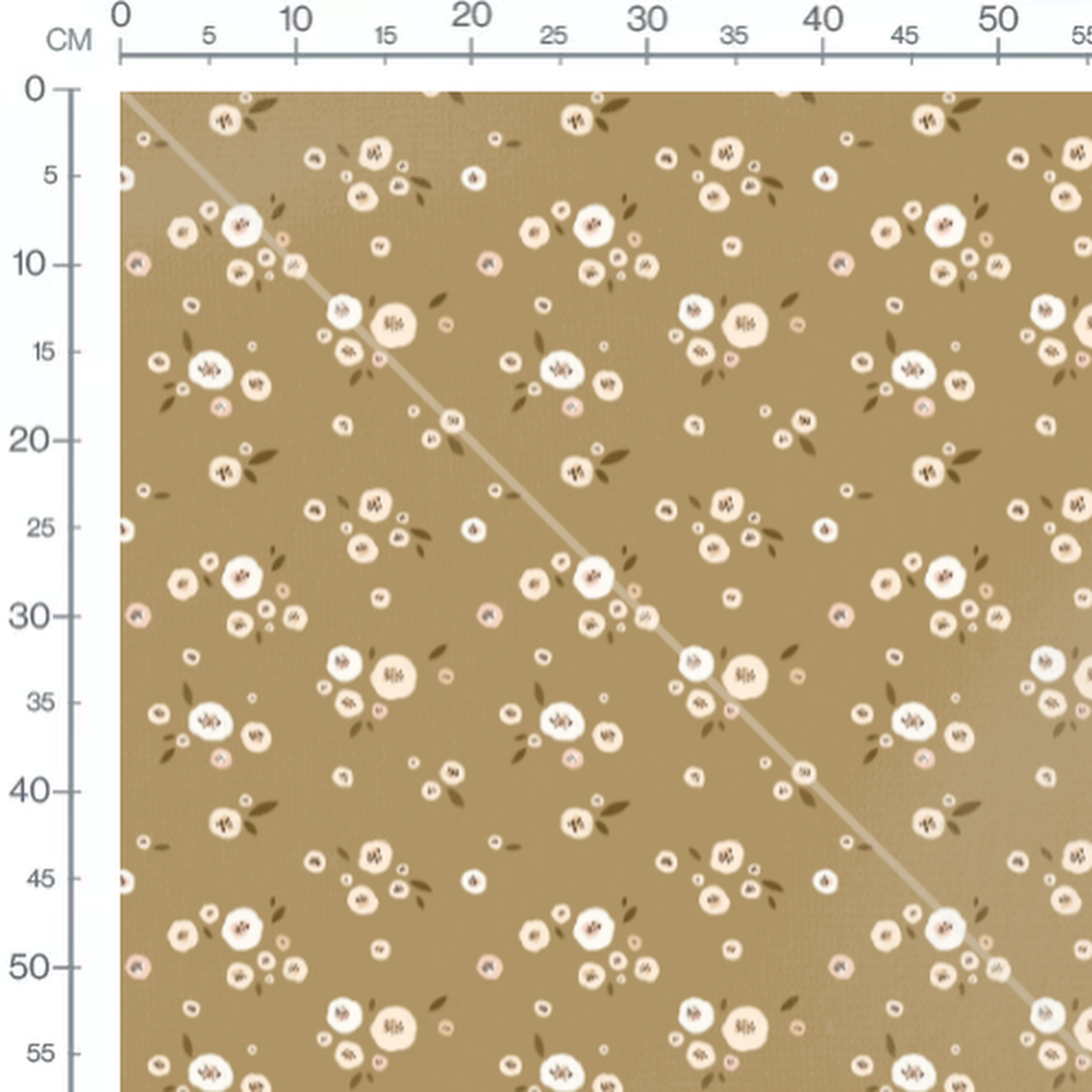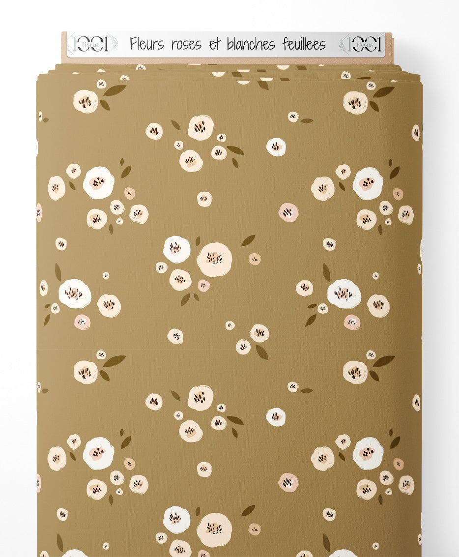 Les fleurs blanches et roses sont entourées de petites feuilles vertes. Les détails noirs au centre des fleurs ajoutent du contraste.Les tissus