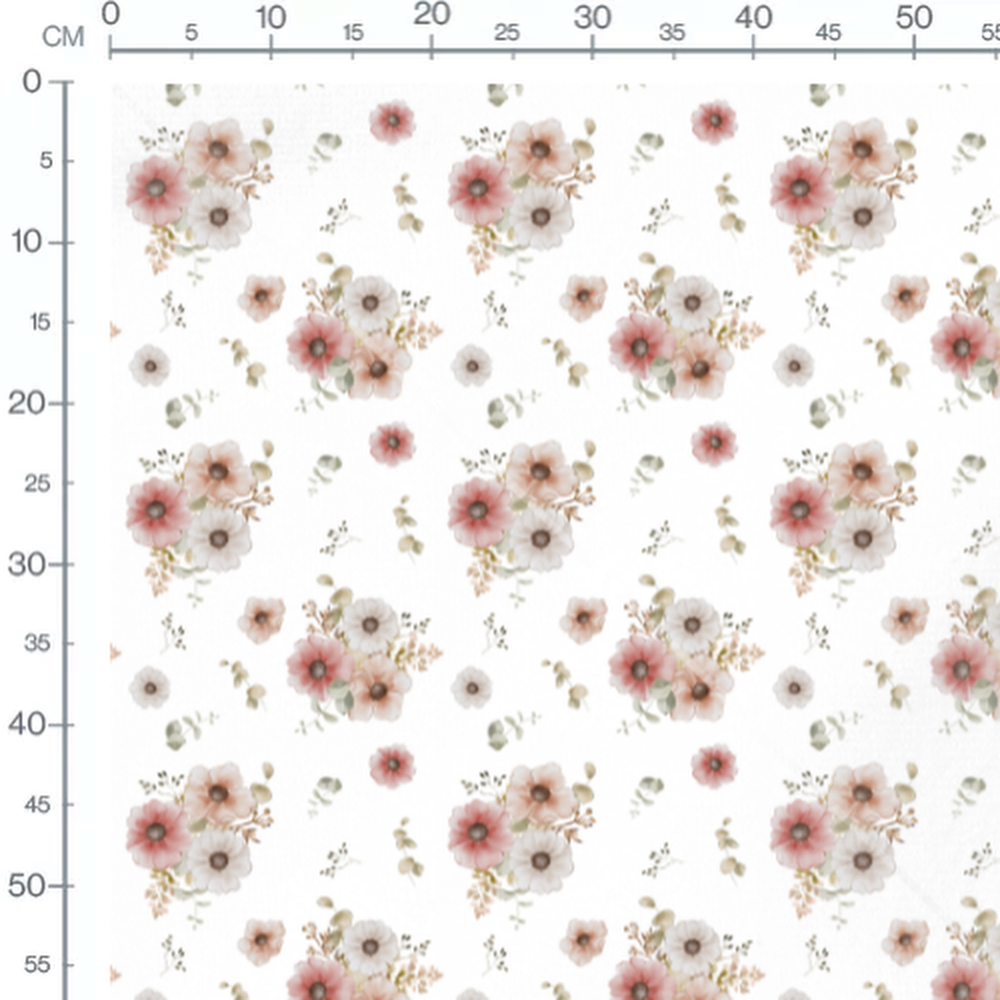 Les fleurs sont entourées de petites feuilles vertes. Quelques touches de brun ajoutent de la profondeur au motif.Les tissus