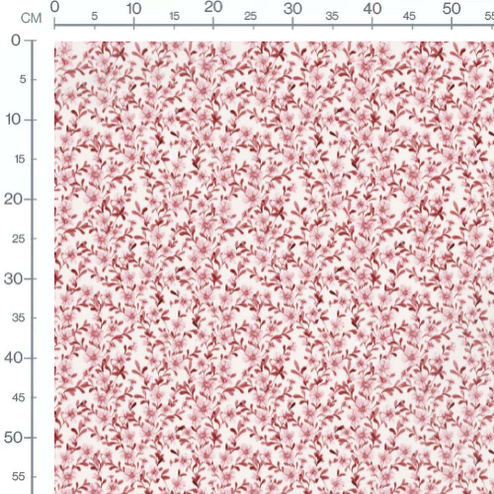 Les fleurs sont de différentes nuances de rose, créant un effet aquarelle. Les feuillages accompagnent les fleurs, ajoutant une touche de verdure subtile. Le fond blanc met en valeur la douceur des couleurs florales.Les tissus