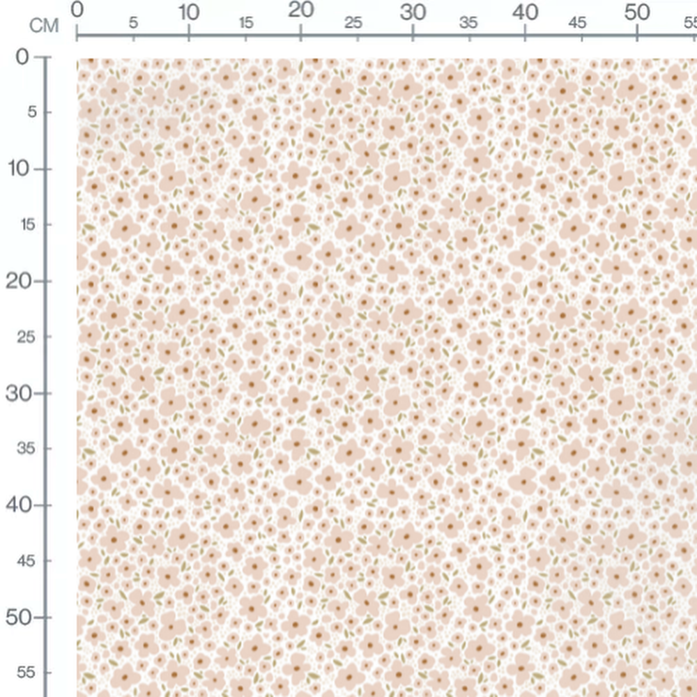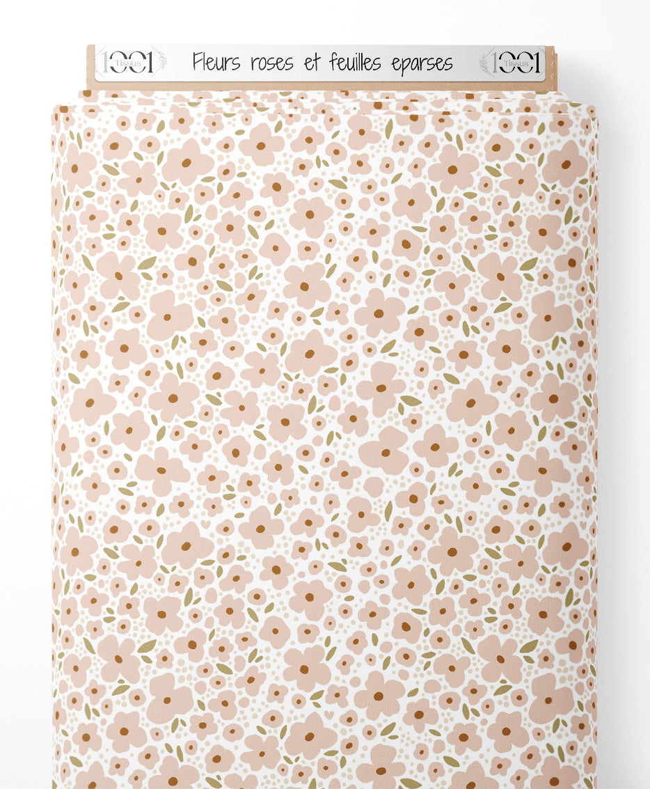 Les fleurs sont de différentes tailles, principalement en rose pâle. Les feuilles vertes ajoutent une touche de contraste au motif floral.Les tissus