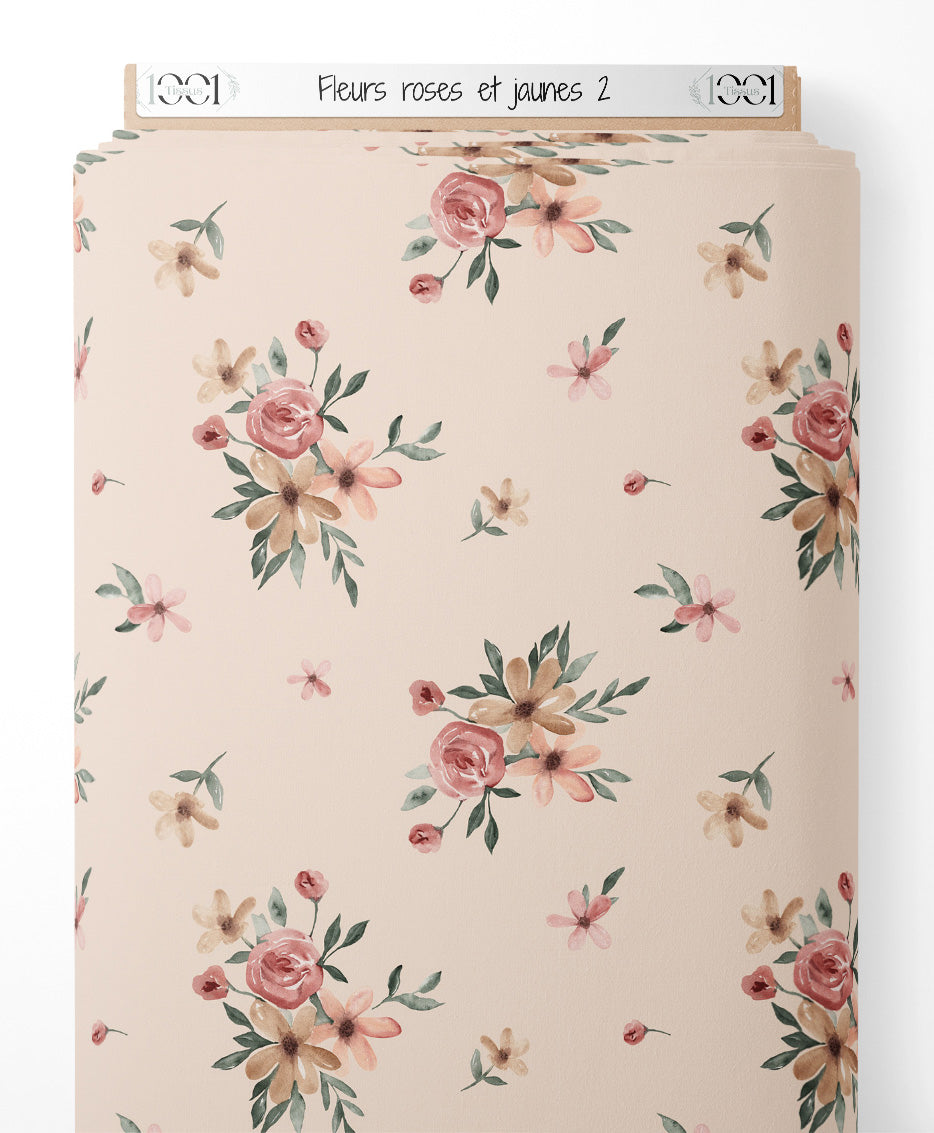 Les fleurs sont de différentes tailles et nuances de rose et jaune. Les feuilles vertes ajoutent un contraste doux au motif floral.Les tissus