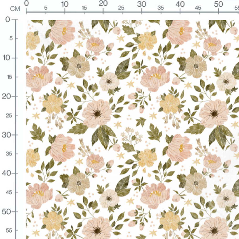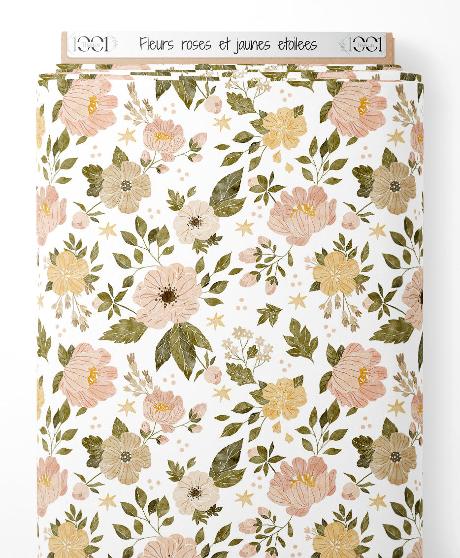 Les fleurs sont de différentes tailles avec des nuances de rose et de jaune. Les feuilles sont d'un vert olive foncé. De petites étoiles beige ajoutent une touche délicate au motif.Les tissus