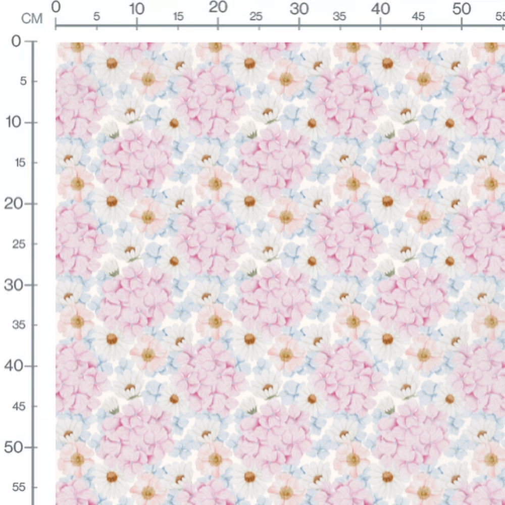 Les fleurs roses sont entourées de pétales blancs délicats. Des nuances de bleu ajoutent une touche douce au motif. Les centres des fleurs sont brun clair, apportant un contraste subtil.Les tissus