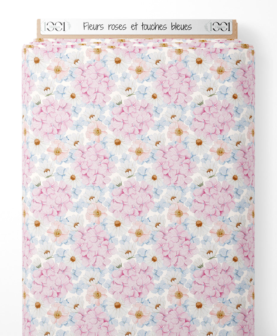 Tissu - Fleurs roses et touches bleues