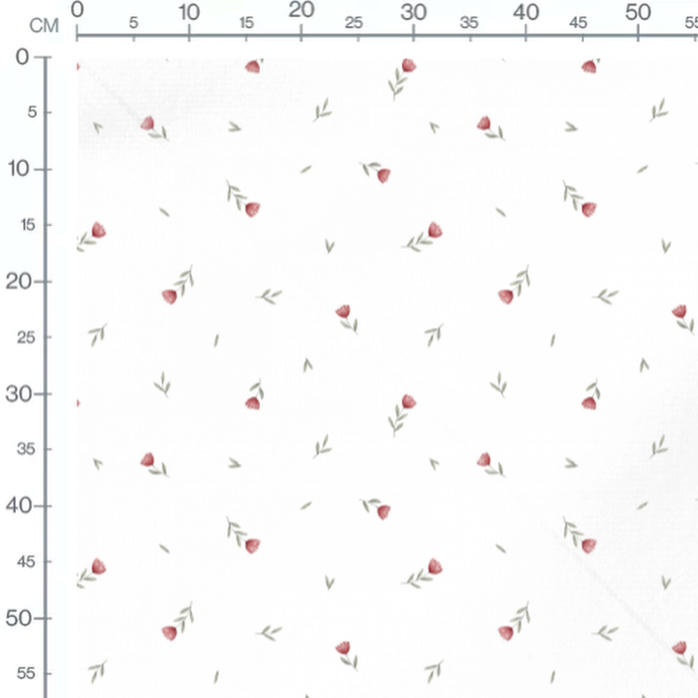 Les fleurs sont de couleur rose pâle avec des détails subtils. Les feuilles vertes accompagnent chaque fleur, ajoutant une touche de naturel. Le fond blanc met en valeur la simplicité et la légèreté du motif.Les tissus