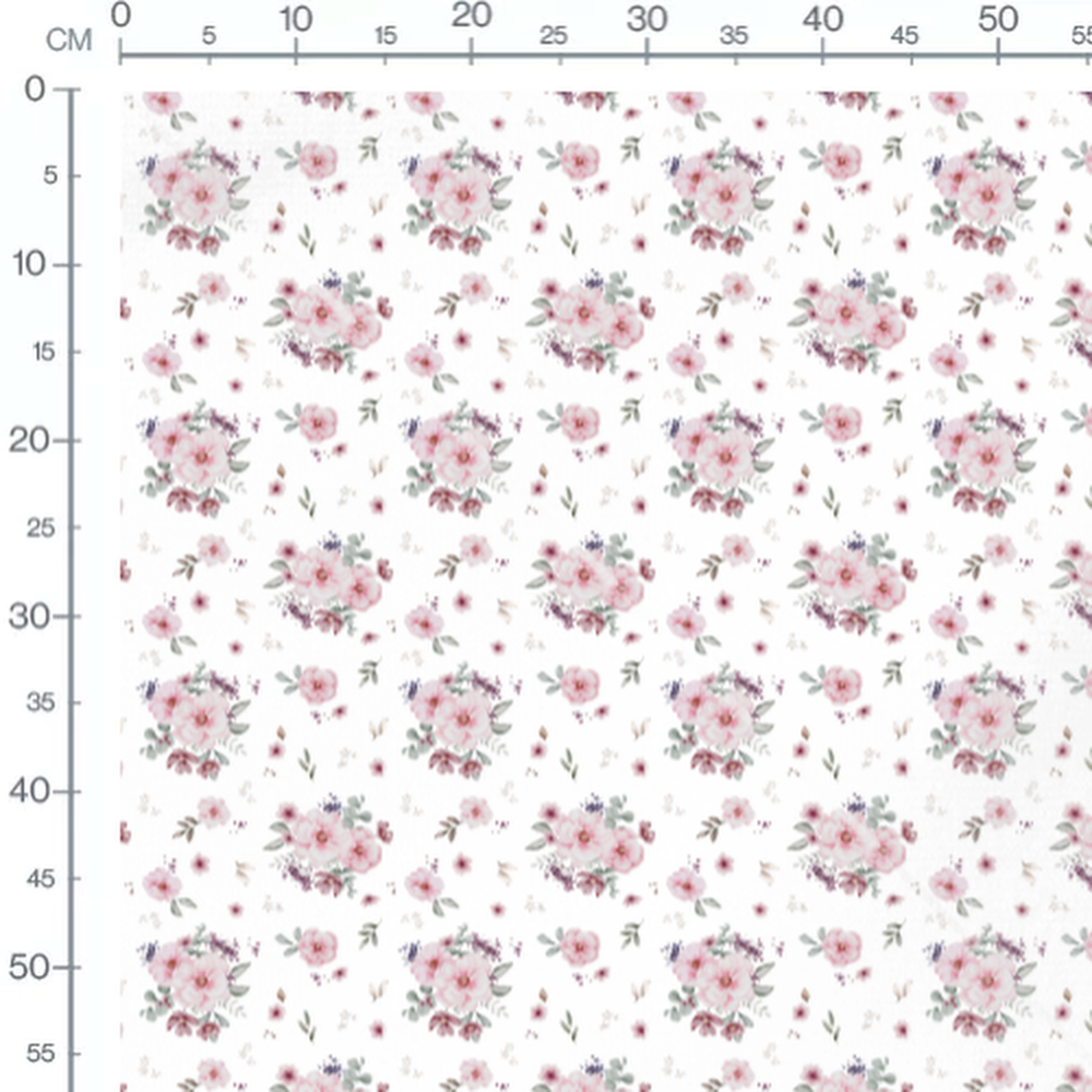 Les fleurs principales sont de grandes roses avec des nuances de rose pâle. De petites fleurs violettes et des baies ajoutent de la profondeur au motif. Les feuilles sont d'un vert doux, apportant une touche naturelle. Quelques petites fleurs isolées parsèment le fond blanc.Les tissus