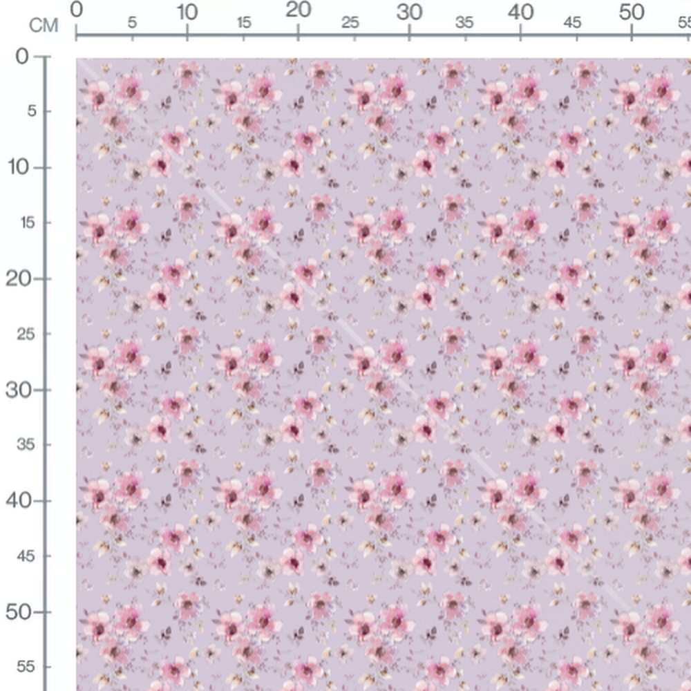 Les fleurs sont de différentes nuances de rose et de violet. Les feuilles ajoutent des touches de brun et de vert. Le fond lavande met en valeur les motifs floraux délicats.Les tissus