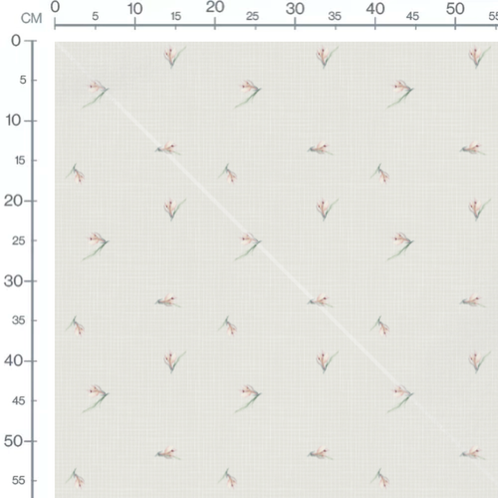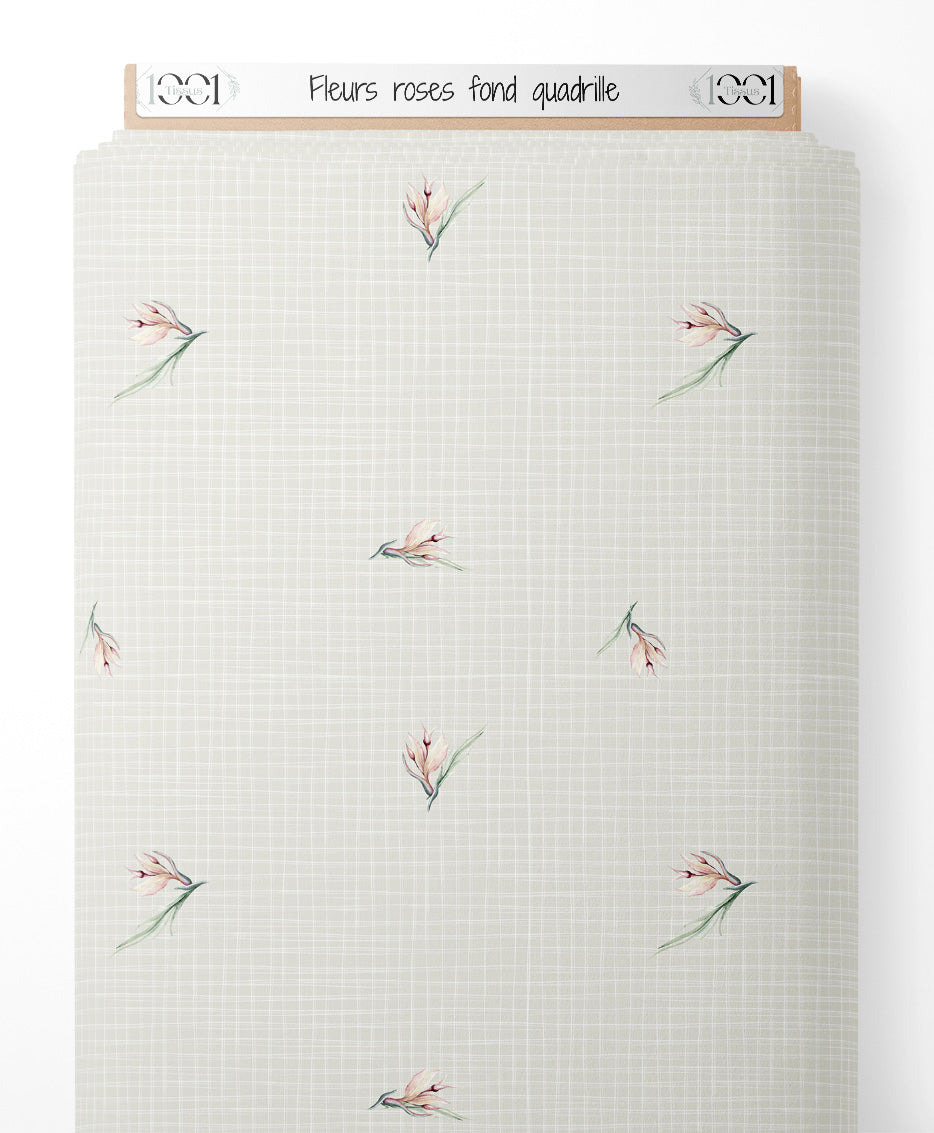 Les fleurs sont de couleur rose pâle avec des nuances de vert. Le fond quadrillé blanc ajoute une touche géométrique subtile.Les tissus