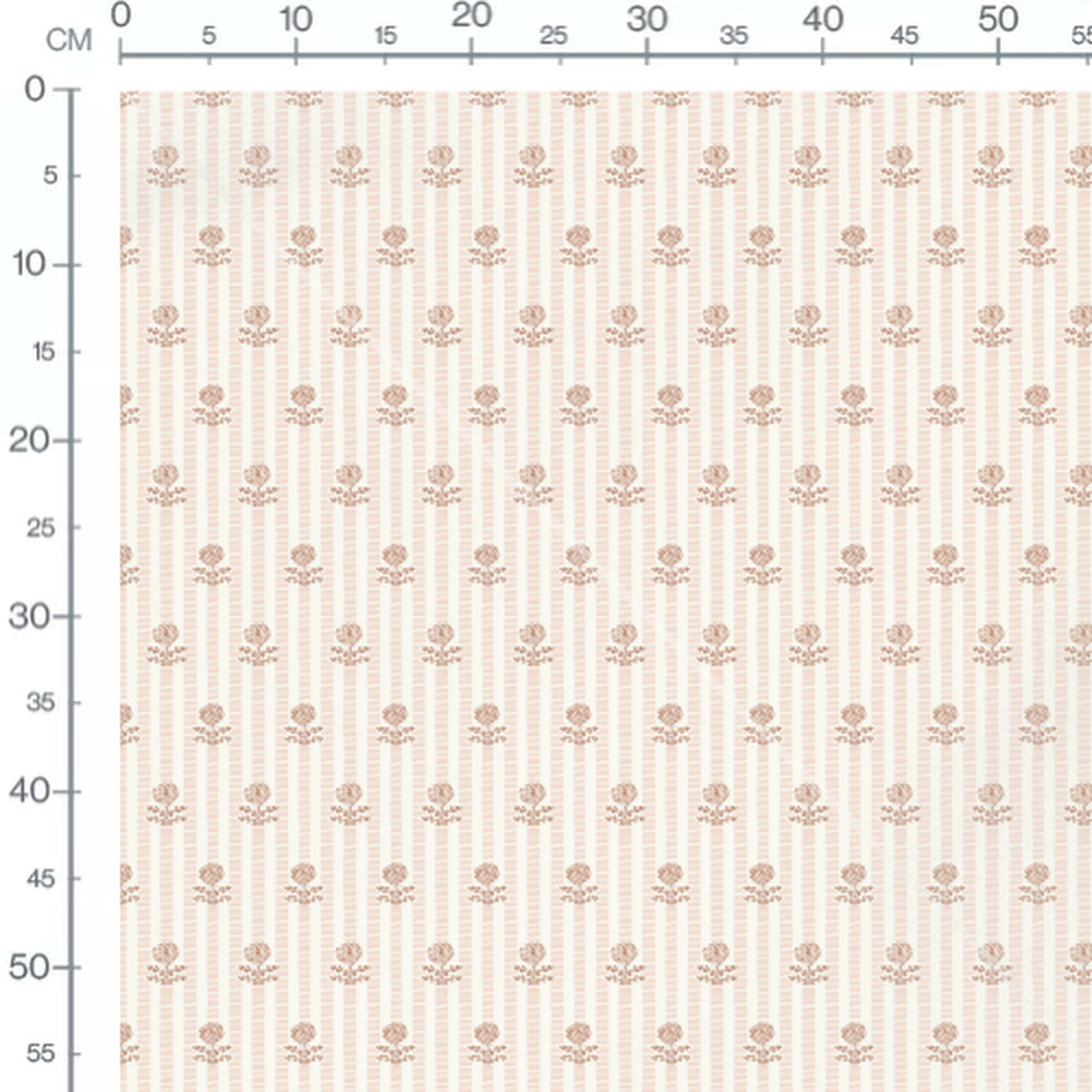 Les fleurs sont entourées de petites feuilles marron. Les rayures alternent entre des nuances de rose et de crème.Les tissus