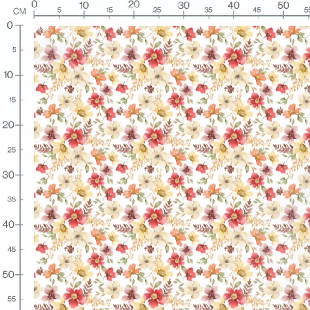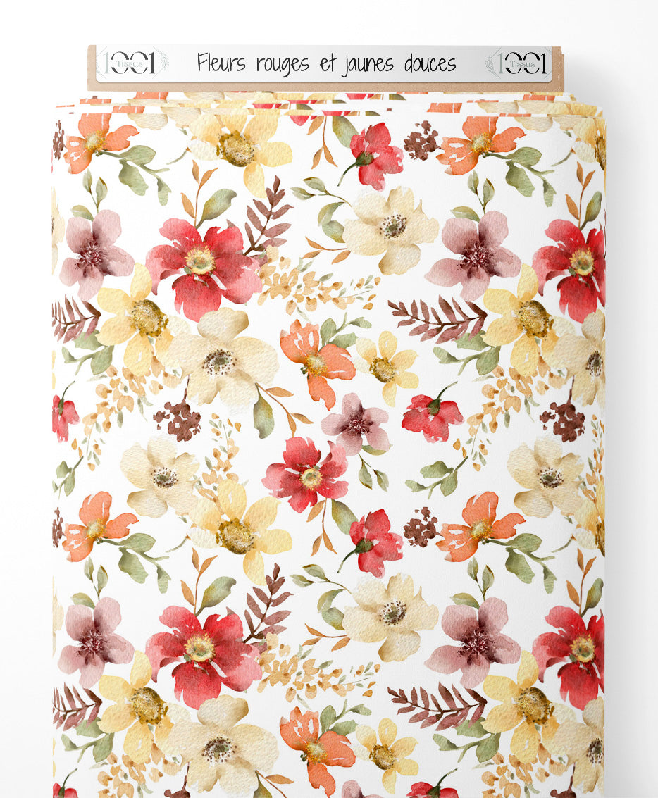 Les fleurs rouges, jaunes et roses sont disposées harmonieusement. Les feuilles vertes et brunes ajoutent une touche naturelle au motif. Les nuances aquarelles créent un effet doux et estompé.Les tissus