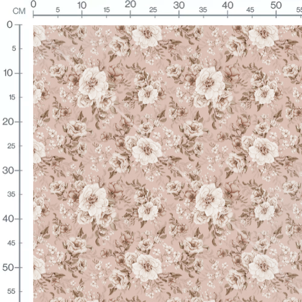 Les grandes fleurs sépia sont entourées de feuilles vertes. De petites fleurs blanches ajoutent de la délicatesse au motif.Les tissus