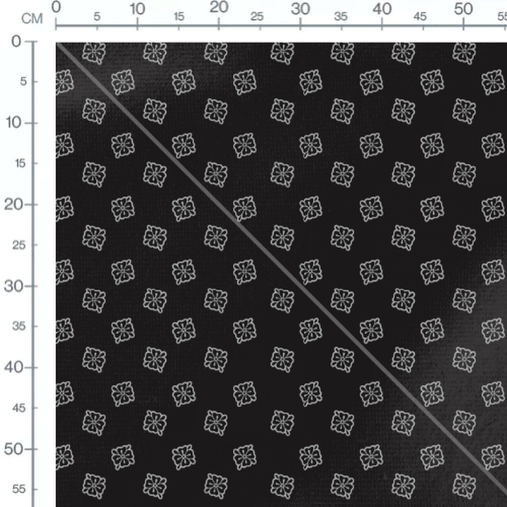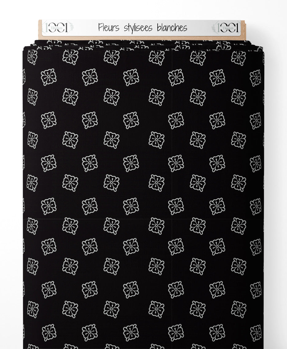 Les fleurs sont dessinées avec des lignes blanches fines. Le fond noir met en valeur le motif floral géométrique.Les tissus