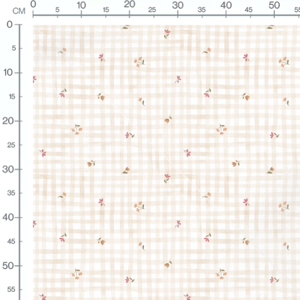 Les fleurs sont dispersées sur un fond à carreaux beige. Les teintes des fleurs varient entre le rose et l'orange, ajoutant une touche de couleur subtile.Les tissus