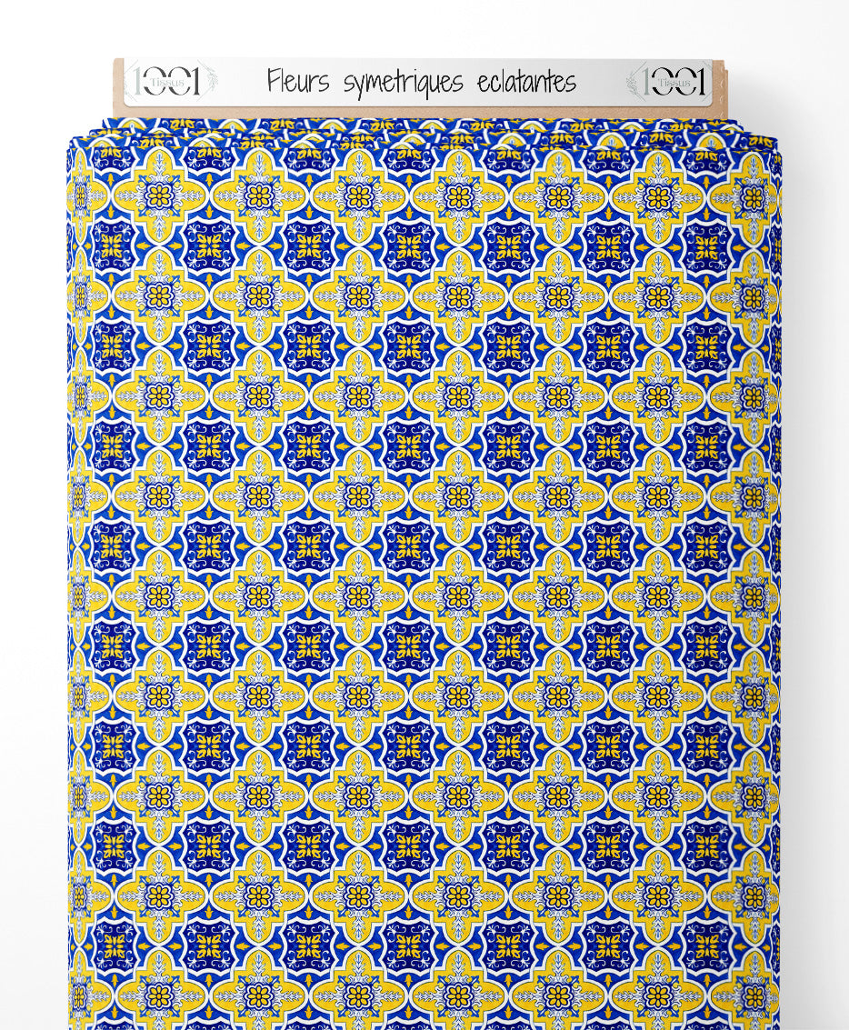 Les motifs floraux sont entourés de formes géométriques bleues et jaunes. Les détails floraux sont symétriques et répétés sur tout le tissu. Les couleurs vives créent un contraste saisissant avec le fond blanc.Les tissus